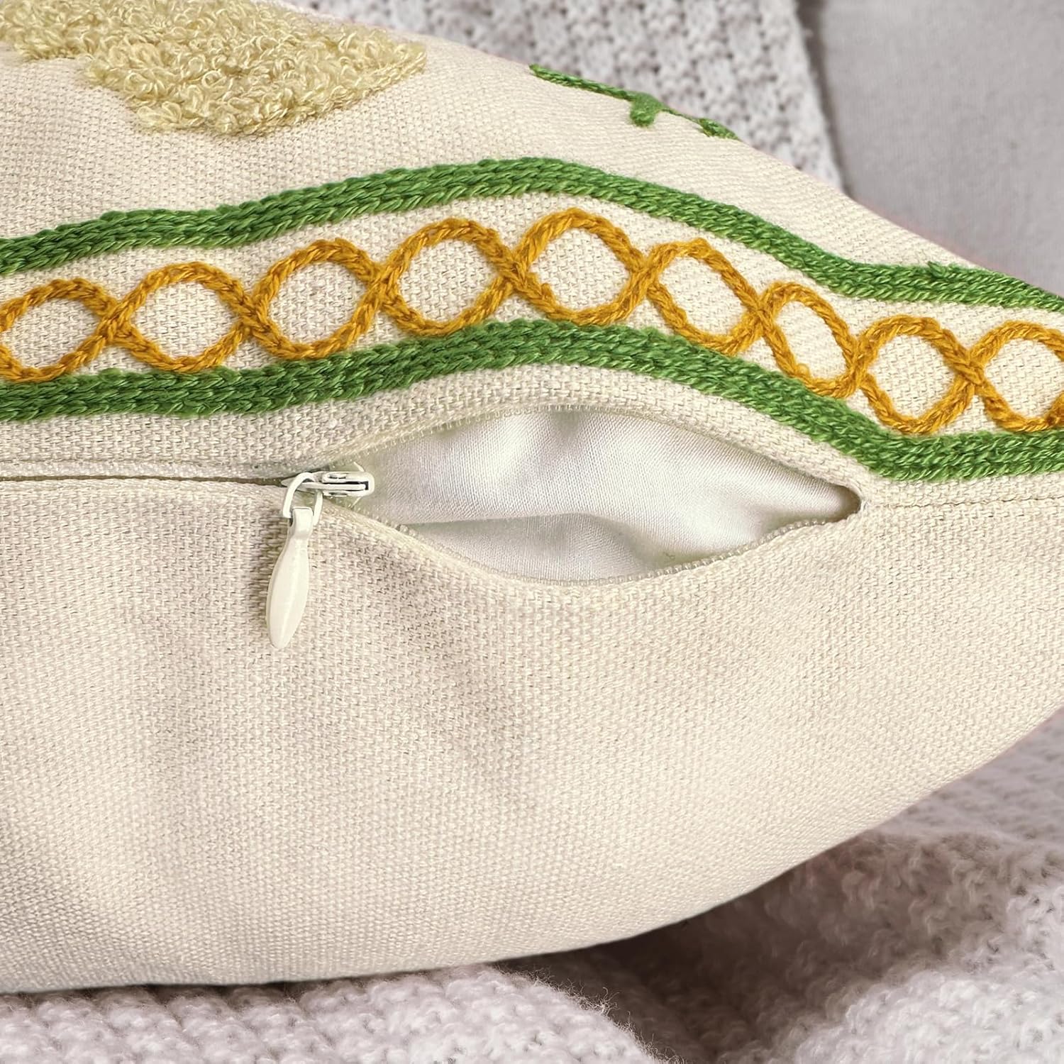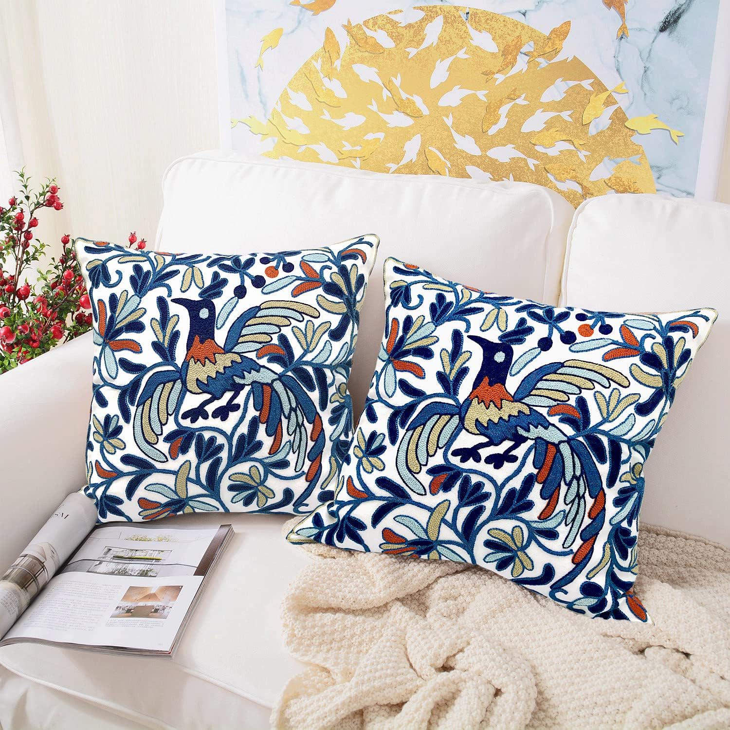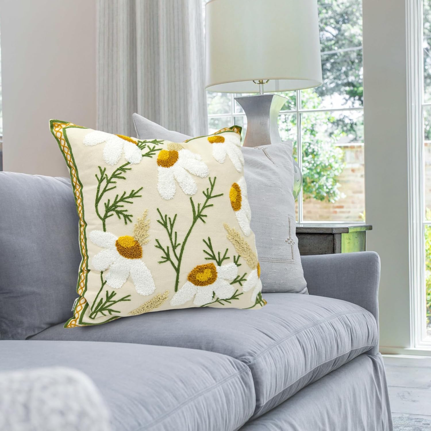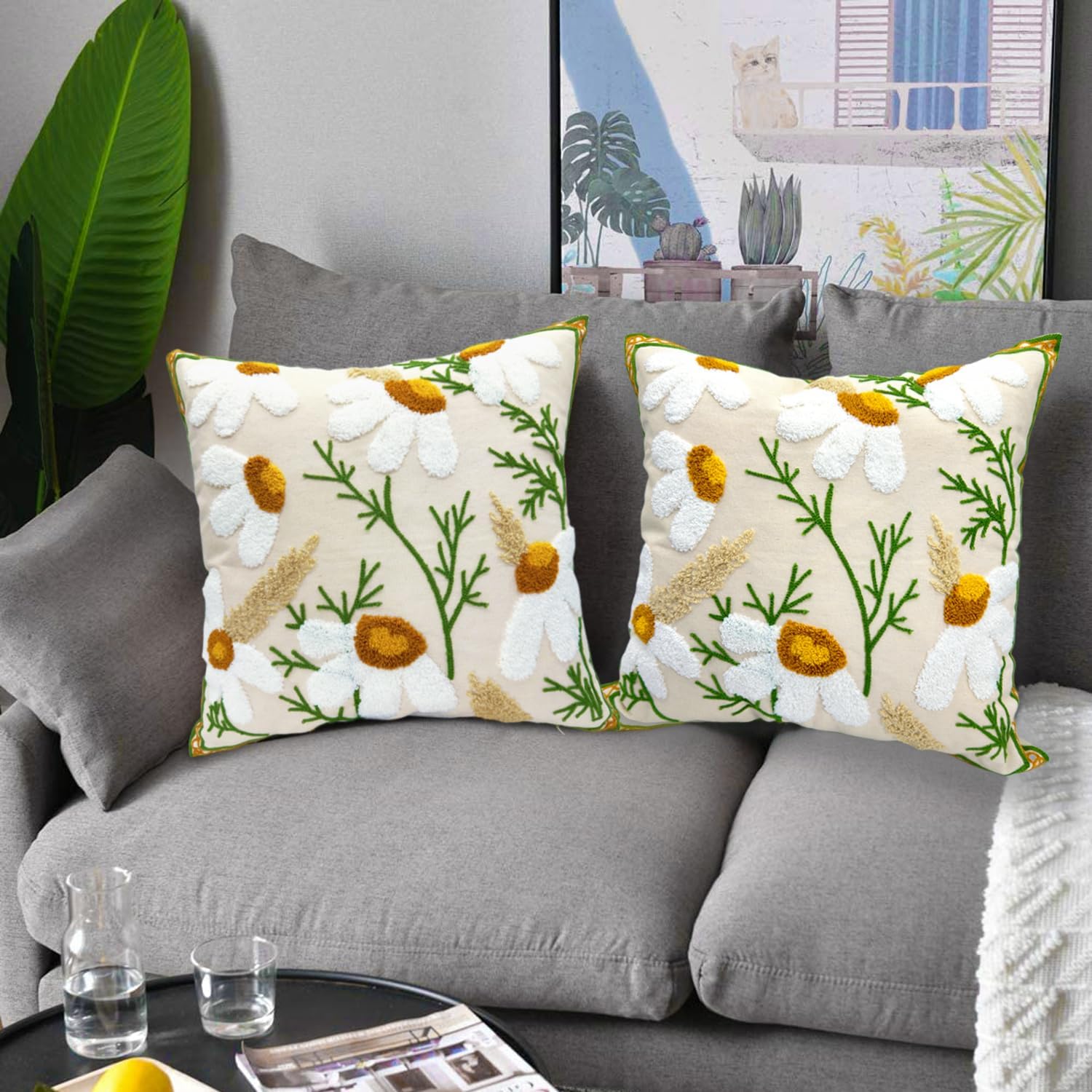 Alysheer Floral Embroidered Fall Decorative Throw Pillow Covers 18"x 18" Set of 2, Farmhouse Daisy Flowers Patterned Canvas Cushion Cases for Couch Bed Living Room Decor