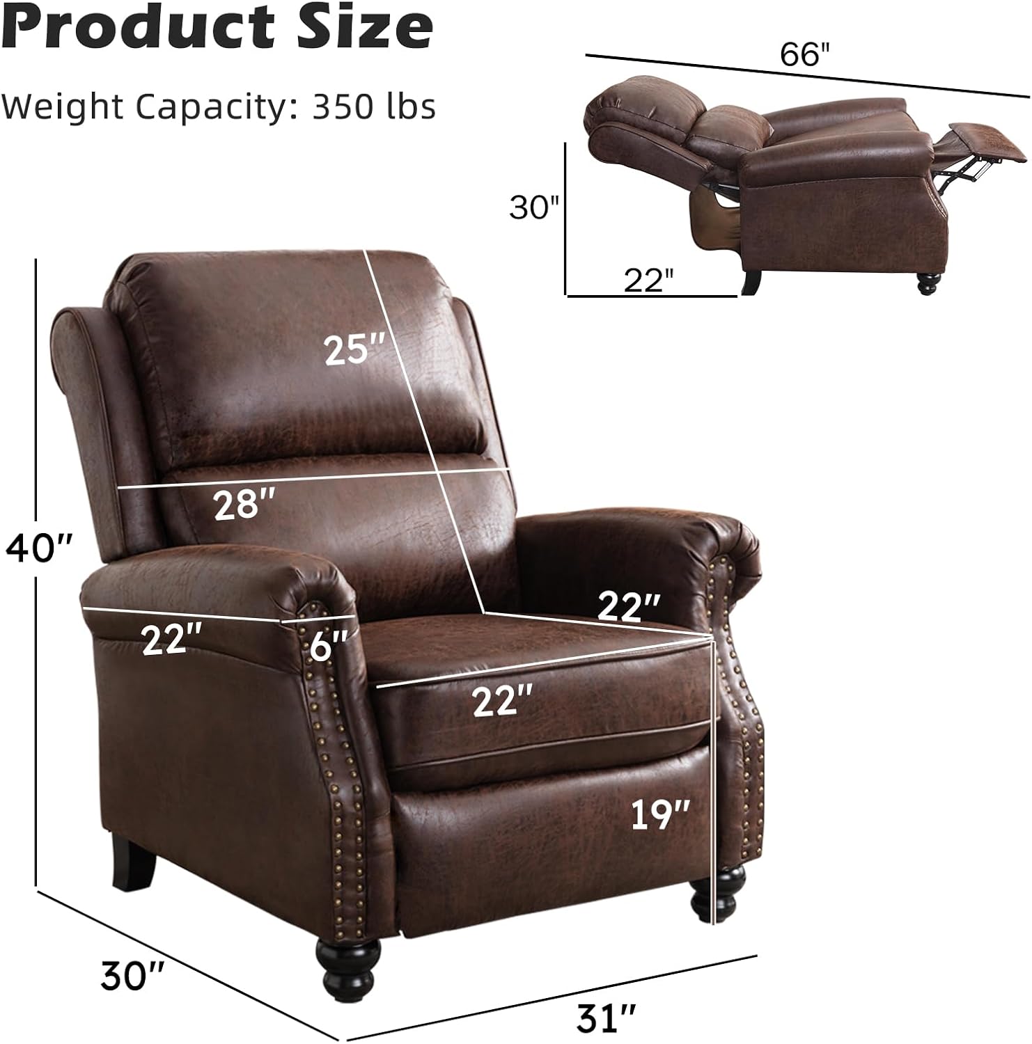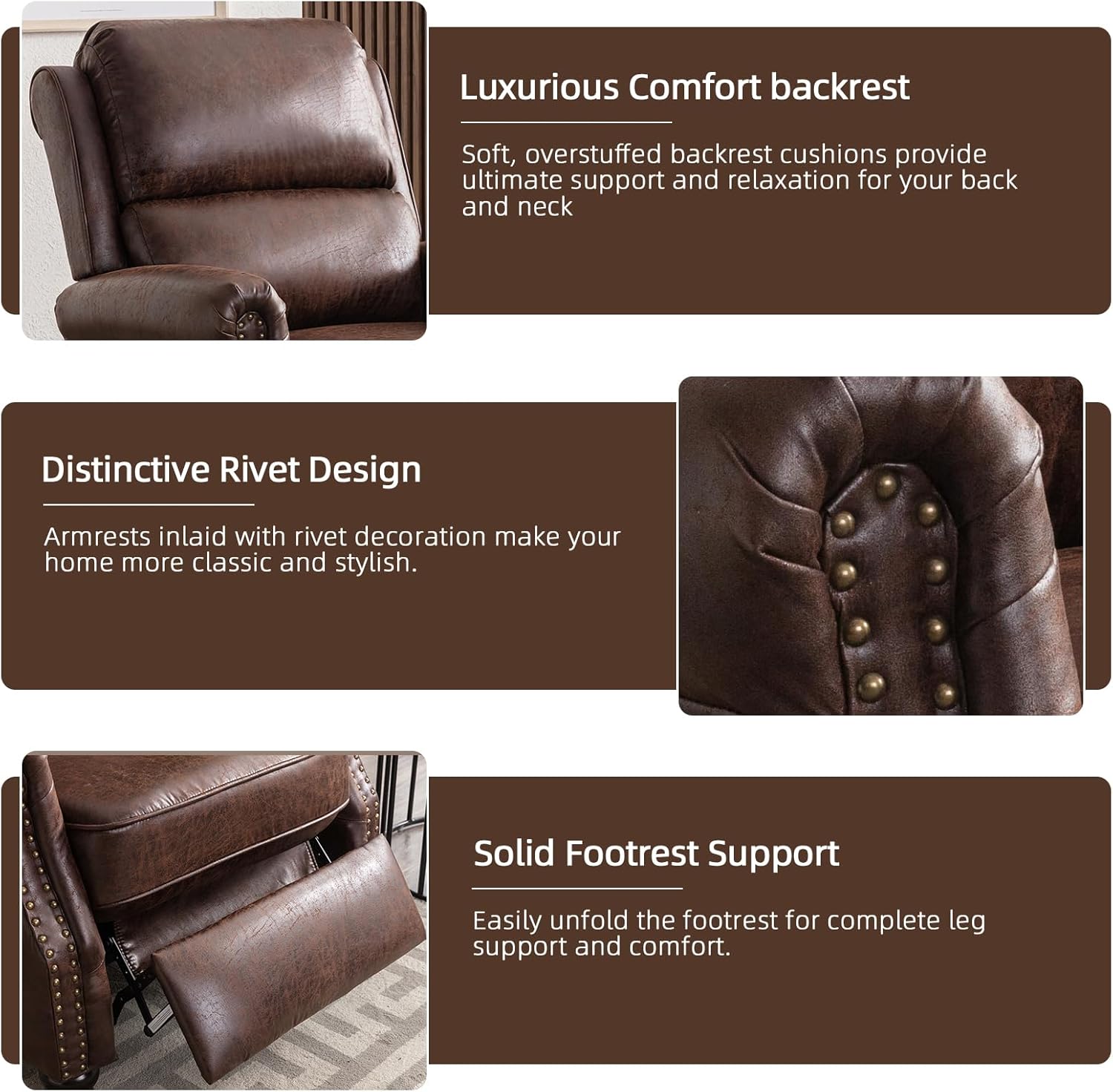 Push Back Recliner Chair Faux Leather Lounge Armchair with Rivet Decoration Wingback Single Sofa Chair with Padded Seat Solid Wood Legs for Living Room, Comfy Upholstered Set of 2, Red Brown